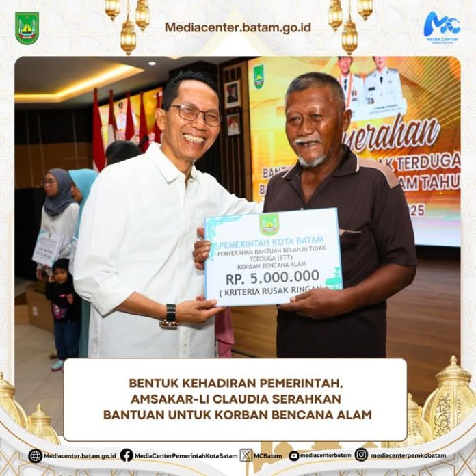 Batamโ Wali Kota Batam, Amsakar Achmad, bersama Wakil Wali Kota Batam, Li Claudia Chandra, menyerahkan bantuan Belanja Tidak Terduga (BTT) untuk korban bencana alam yang terjadi pada awal tahun 2025. Penyerahan bantuan ini berlangsung di Kantor Wali Kota Batam, Selasa (11/3/2025).