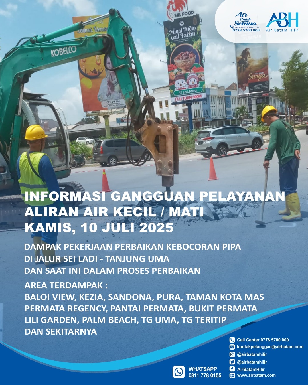 Dengan itu pihak Air Batam Hilir menginformasikan, dampak pekerjaan Perbaikan kebocoran Pipa di Jalur Sei Ladi – Tanjung Uma dan saat ini dalam proses perbaikan :