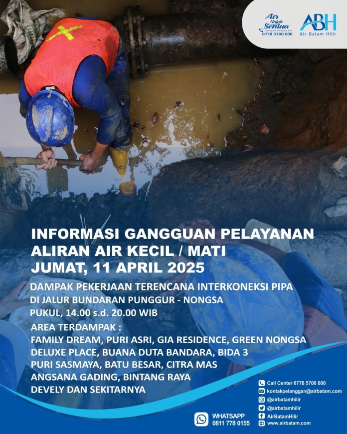Batam -Air Batam Hilir menginformasikan, pelaksanaan pekerjaan terencana Interkoneksi Pipa DN 500mm x 300mm di jalur Bundaran Punggur – Nongsa yang bertujuan untuk meningkatkan pelayanan pelanggan dan akan dilakukan pada :Jumat, 11 April 2025 Pukul, 14.00 s.d. 20.00 WIB