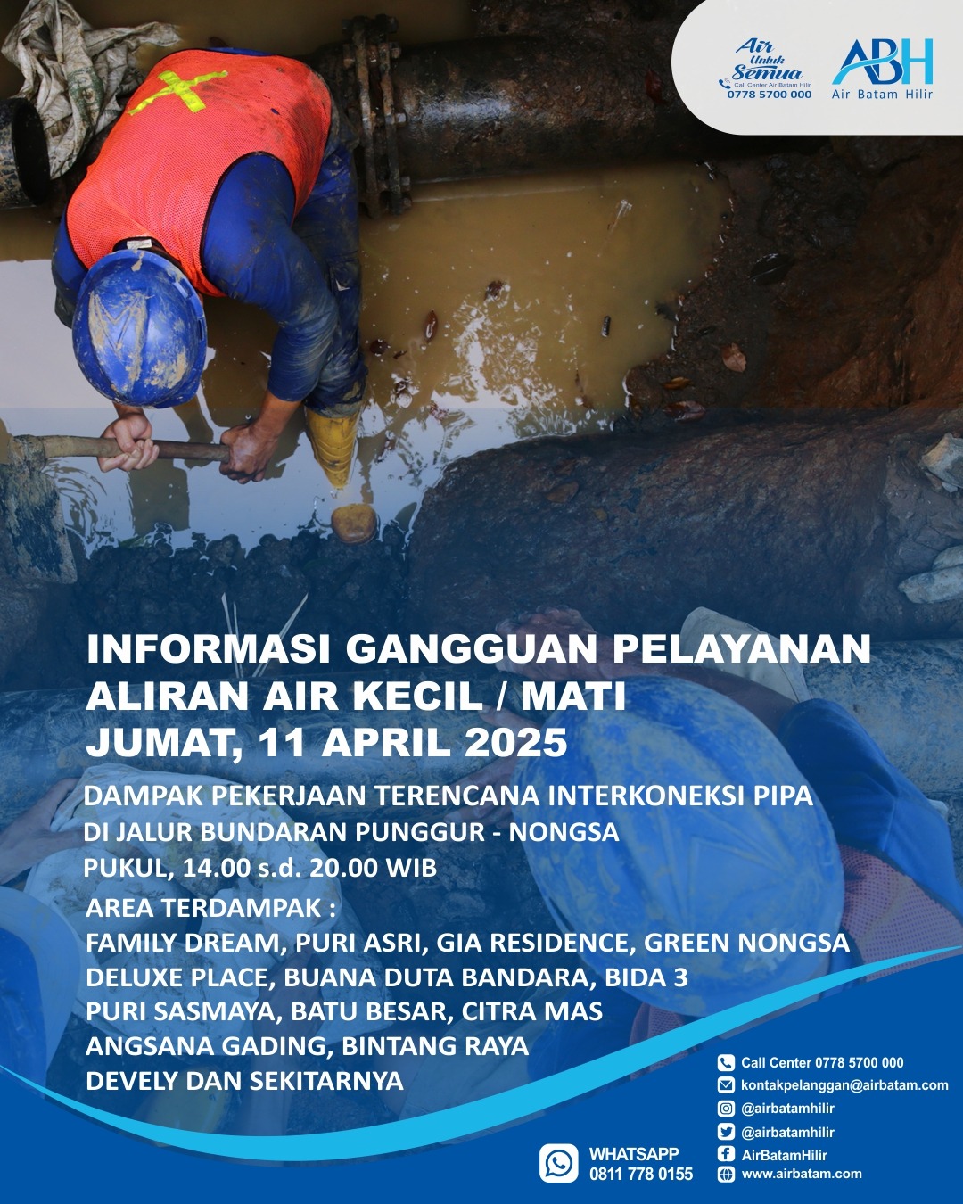 Area terdampak : Family Dream, Puri Asri, Pesantren, GIA Residence, Green Nongsa City, Deluxe Place, Devely Residence, Buana Duta Bandara, Angsana Gading, Puri Samanya, Bida3, Batu Besar, Citramas, bintang raya dsk.dan sekitarnya.