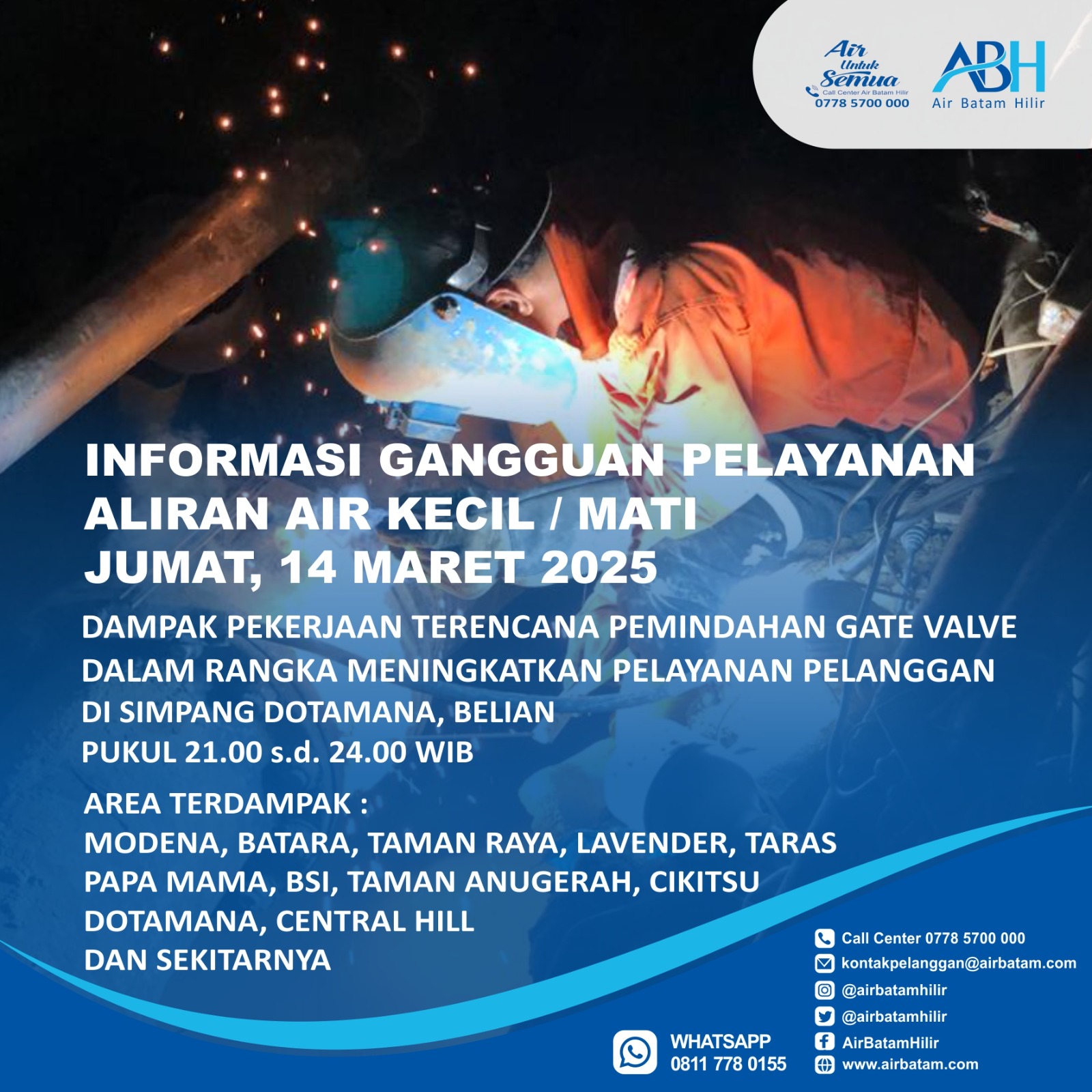 Batam -Air Batam Hilir menginformasikan, pelaksanaan pekerjaan terencana Pemindahan Gate Valve 200mm di Simpang Dotamana, Belian yang bertujuan untuk meningkatkan pelayanan pelanggan dan akan dilakukan pada :Jumat, 14 Maret 2025,Pukul, 21.00 s.d. 24.00 WIB