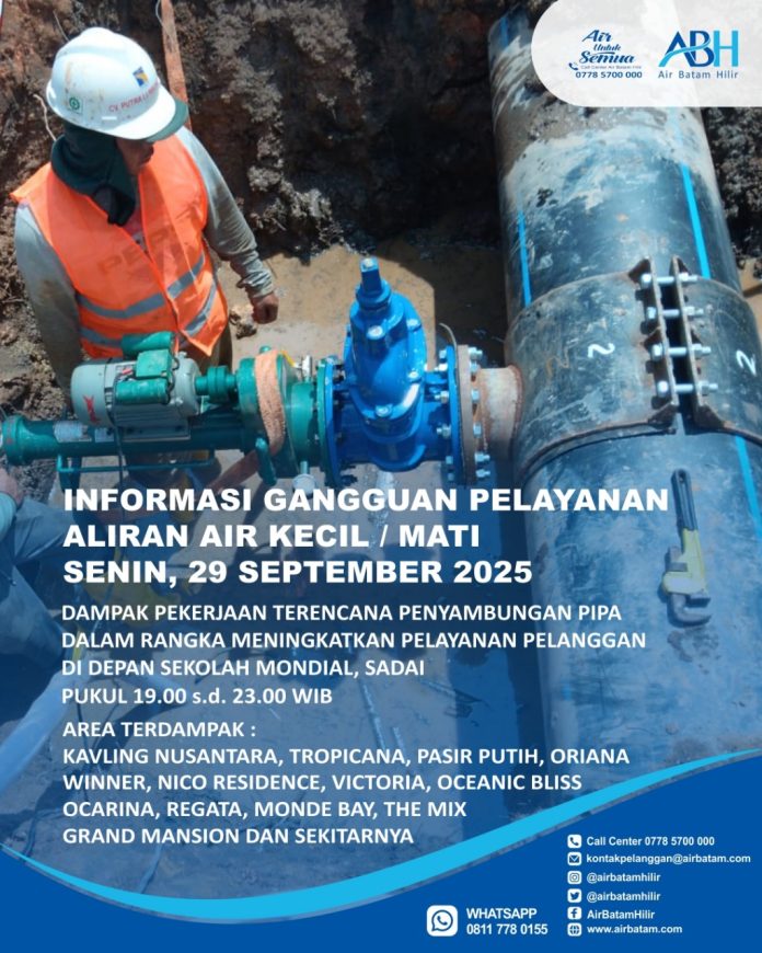 Untuk itu , Air Batam Hilir menginformasikan, pelaksanaan pekerjaan terencana Penyambungan Pipa DCIP 200mm