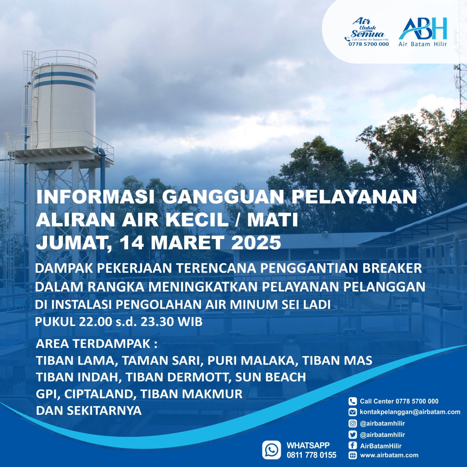 Batam -Air Batam Hilir menginformasikan, pelaksanaan pekerjaan terencana Penggantian Breaker Incoming Intake Phase 2 di Instalasi Pengolahan Air Minum Sei Ladi, yang bertujuan untuk meningkatkan pelayanan pelanggan dan akan dilakukan pada :Jumat, 14 Maret 2025 Pukul, 22.00 s.d. 23.30 WIB