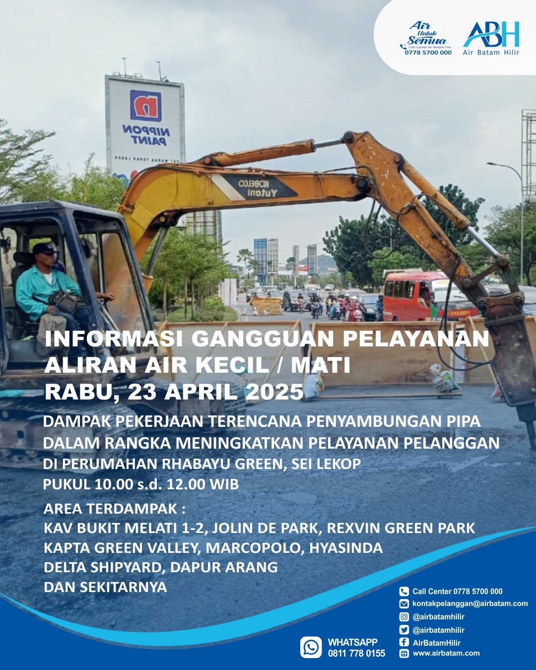 Batam -Air Batam Hilir menginformasikan, pelaksanaan pekerjaan terencana Penyambungan Pipa HDPE 160mm di Perumahan Rhabayu Green, Sei Lekop yang bertujuan untuk meningkatkan pelayanan pelanggan dan akan dilakukan pada :Rabu, 23 April 2025 Pukul, 10.00 s.d. 12.00 WIB