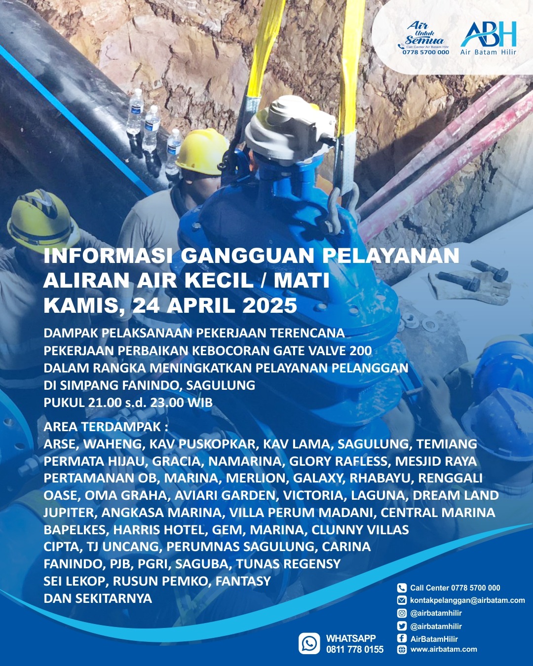 Batam -Air Batam Hilir menginformasikan, pelaksanaan pekerjaan terencana perbaikan kebocoran gate valve 200 di Simpang Fanindo, Sagulung yang akan dilakukan pada :Kamis, 24 April 2025 Pukul, 21.00 s.d. 23.00 WIB