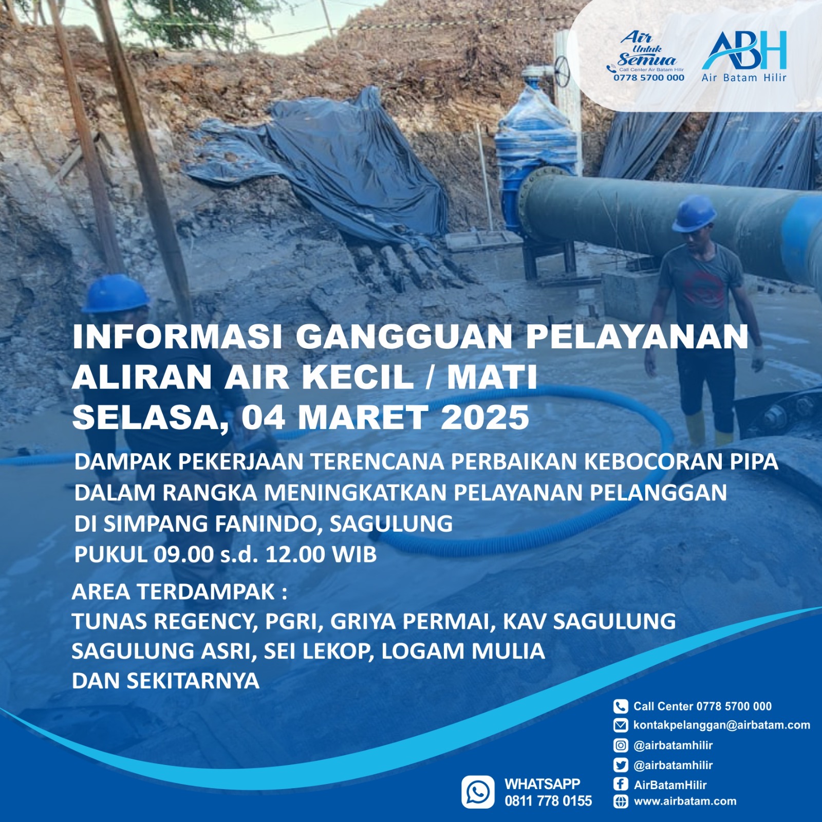 Batam -Air Batam Hilir menginformasikan, pelaksanaan pekerjaan terencana Perbaikan kebocoran Pipa dan pemasangan Gate Valve 200mm & 300mm di Simpang Fanindo, Sagulung yang bertujuan untuk meningkatkan pelayanan pelanggan dan akan dilakukan pada :Selasa, 04 Maret 2025 Pukul, 09.00 s.d. 12.00 WIB.