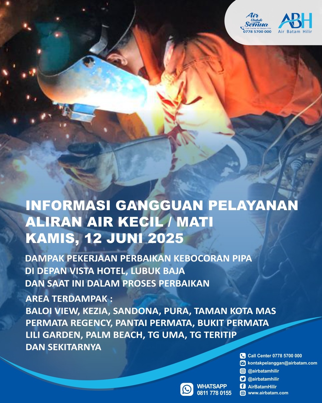 Air Batam Hilir menginformasikan, dampak pekerjaan Perbaikan kebocoran Pipa di Depan Hotel Vista, Lubuk Baja dan saat ini dalam proses perbaikan.