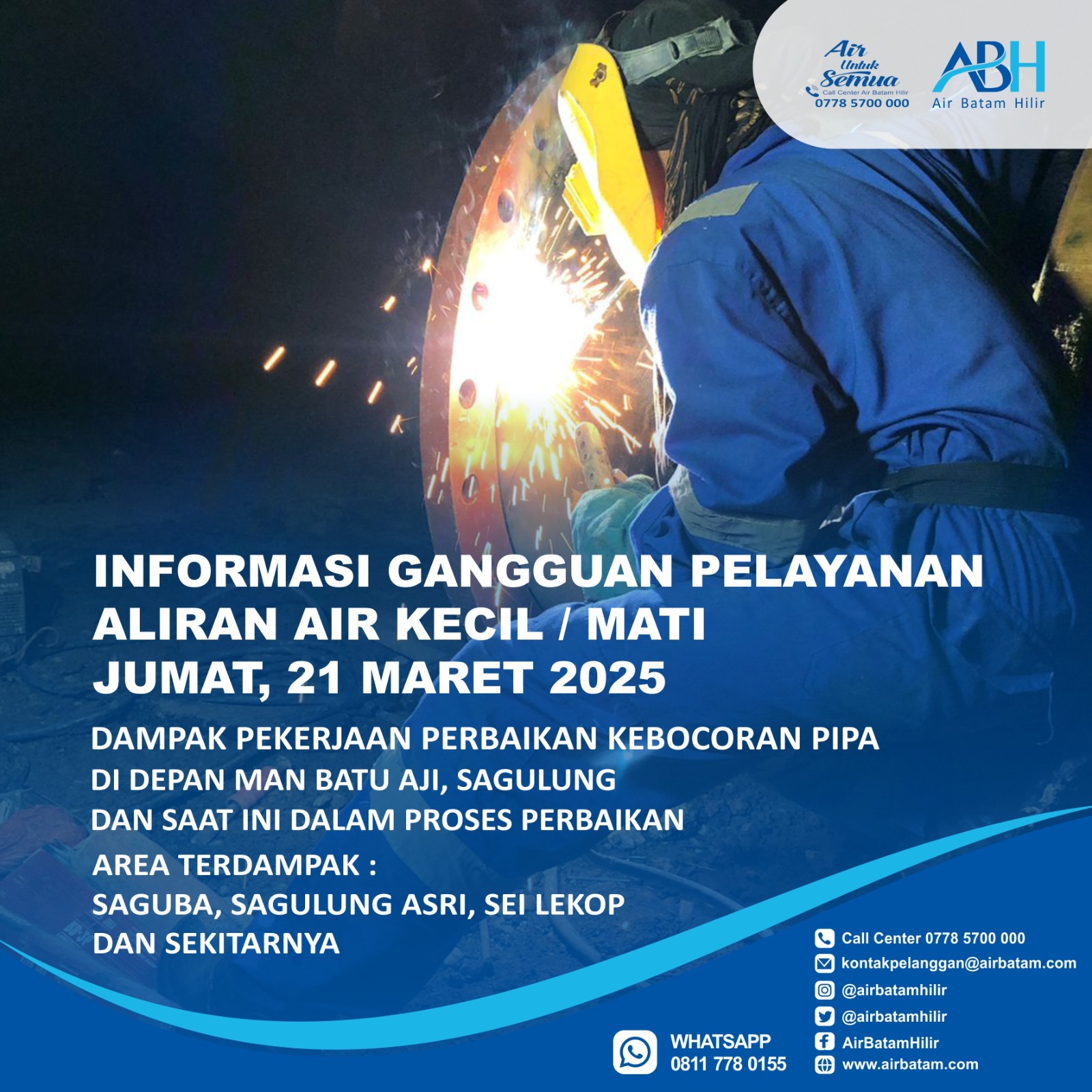 Batam -Air Batam Hilir menginformasikan, dampak pekerjaan Perbaikan kebocoran Pipa di Depan MAN Batu Aji, Sagulung dan saat ini dalam proses perbaikan.