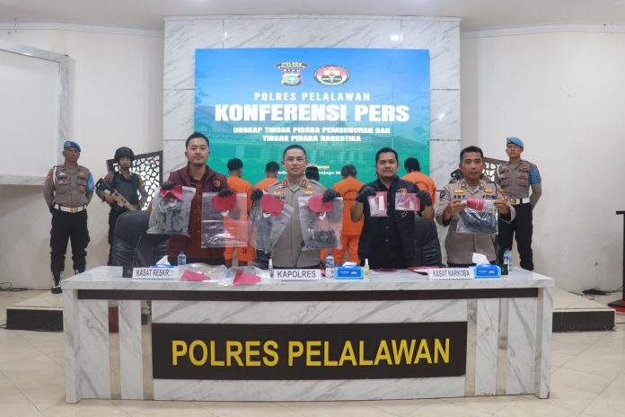 .Pelalawan – Polres Pelalawan respon cepat dua kejadian yang menggemparkan masyarakat Pelalawan terkait adanya pembunuhan terduga maling Handphone dan peredaran Narkotika jenis Sabu yang cukup meresahkan di wilayah Kecamatan Langgam Kabupaten Pelalawan Kamis(10/4/2025), di Aula Teluk Meranti Mapolres Pelalawan, Kapolres Pelalawan AKBP Afrizal Asri SIK, melalui jajarannya Satreskrim dan Satnarkoba berhasil menangkap para tersangka.